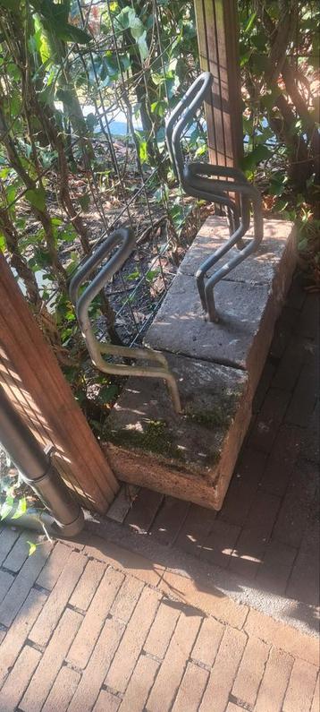 Drie oerdegelijke fietsklemmen, ideaal om fietsen netjes te parkeren. Nooit meer omvallende fietsen tegen je auto. Ze zijn stevig en functioneel. Gratis op te halen.