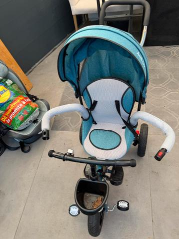 Een blauwe driewieler met een zonnekap en een duwstang. Er zit een bel op het stuur en een mandje aan de voorkant. De zitting is verstelbaar.