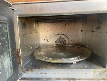 Een moulinex supreme mini 850 w magnetron. Het apparaat is wit met een zwart rooster aan de voorkant. Binnenin zit een draaiplateau. De magnetron heeft een digitaal display en knoppen aan de rechterka