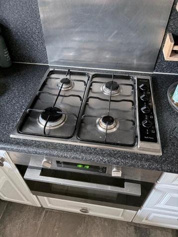 Goed werkend inbouw gasstel. Behalve: vonk functie werkt niet voor alle pitten, maar werkt mogelijk weer na schoonmaak. Breedte 59,5 cm diepte 45,5 cm gaat weg in verband met nieuwe keuken.