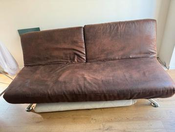 Dit is een bruin slaapbankje. De rugleuning kan plat, waardoor het een bed wordt. Het bankje heeft metalen poten. De stof heeft een wat verweerde look. Maten b120xl190xh40