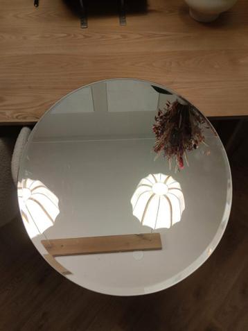 Deze ovale spiegel is 60 x 50 cm. Er zit een klein randje aan de spiegel. De spiegel heeft hele kleine gebruikssporen.