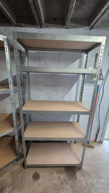 Twee gebruikte stellingkasten te koop: een rechthoekig model en een hoekmodel. Beide kasten zijn voorzien van 5 planken. De planken vertonen gebruikerssporen, maar zijn nog volledig functioneel en dra