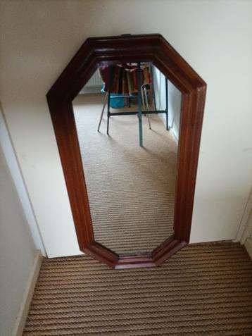 Deze retro spiegel heeft een houten lijst en een achthoekige vorm. De afmetingen zijn 80 bij 40 centimeter. De spiegel is gebruikt.