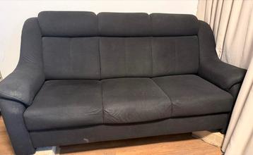 Zwarte stoffen bank met drie zitkussens en drie rugkussens. De bank heeft brede armleuningen en een rechte vorm. De stof is donker van kleur.