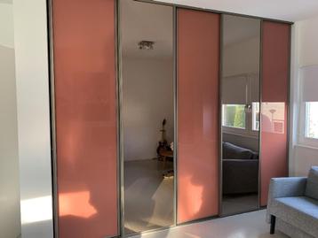 Grote inbouwkast met 5 schuifdeuren: 3 schuifdeuren zijn oranje en 2 schuifdeuren zijn van licht getint spiegelglas. De deuren lopen op wielen in twee rails binnenwerk met 5 roeden en 2 laden en veel