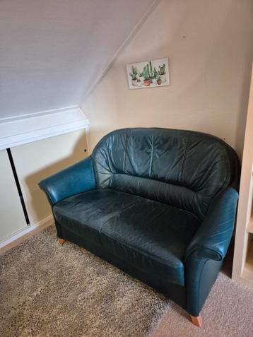 Een donkergroene tweezitsbank met houten poten. De bank heeft een gebogen rugleuning en armleuningen. Het leer heeft wat gebruikssporen. Hoogte zitvlak ca. 42 Cm breedte bankje ca. 145 Cm gratis af te