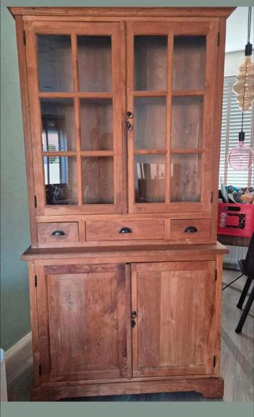Mooie, robuuste houten kast met glazen deuren en lades in het bovengedeelte en dichte deuren in het onderste gedeelte. Ideaal voor het opbergen van servies, boeken of decoratie. De kast is gebruikt. A