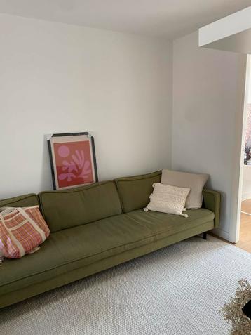Groene bank, kan nog een keer door. Er zitten een paar kleine haaltjes aan de achterkant, zoals te zien op de foto. Verder is de bank nog prima. Gratis ophalen, begane grond amsterdam 290cm lang, 90 b