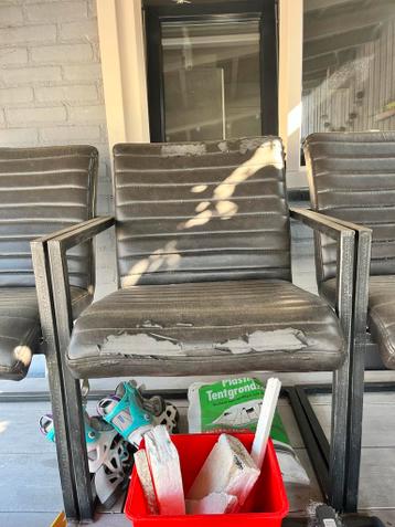 Aangeboden: 4 stevige stoelen met een metalen frame. De stof van de zittingen en rugleuningen is versleten en dient opnieuw gestoffeerd te worden. Ideaal voor de handige klusser die deze stoelen een t