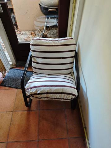 Deze stoel heeft een donker metalen frame en twee gestreepte kussens. De kussens zijn wit met bruine strepen. De hoes is afneembaar