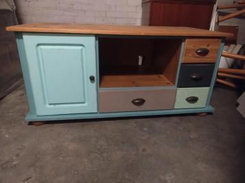 Tv-meubel, gratis ophalen. Het meubel is behandeld met krijtverf in verschillende pastelkleuren. Het bovenblad is van onbehandeld hout. Het meubel beschikt over een kastje met een plank, een open vak
