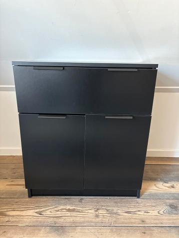 Handige zwarte opbergkast met een lade en twee deurtjes. De kast is in goede staat, het deurtje is eenvoudig recht te zetten. Afmetingen: 60 cm breed, 30 cm diep en 70 cm hoog.