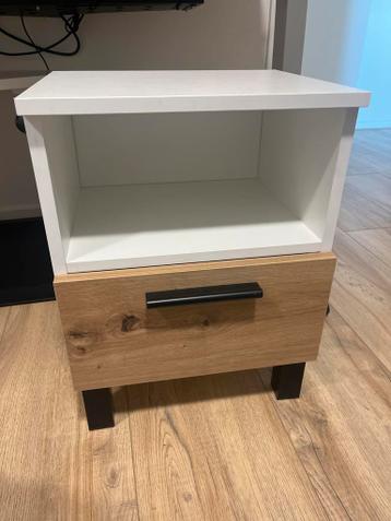 Dit nachtkastje heeft een open vak en een lade. Het is wit met een houtkleurige lade en zwarte pootjes. Het kastje is gratis af te halen.