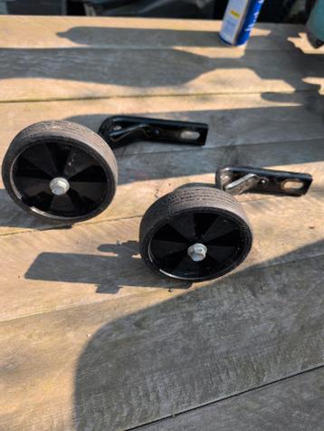 Een setje zijwieltjes voor een kinderfiets. De wieltjes zijn zwart en hebben een zwart frame. Ze zien er nog goed uit.