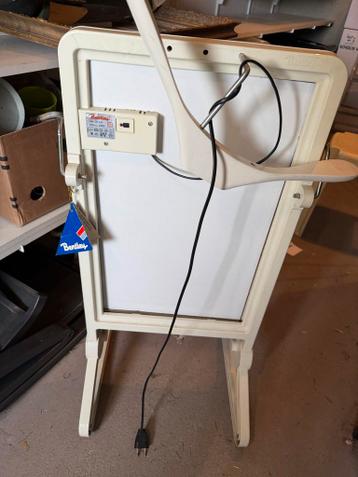 Dit is een vintage broekenpers van het merk bentley. Het apparaat is wit van kleur en heeft een zwart snoer. Het is een staand model en heeft een houten hanger.
