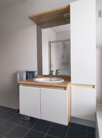 Badkamermeubel met wasbak, kraan, spiegel, verlichting, stopcontact en kast onder de wasbak. Let op: de hoge kast rechts naast de wasbak is niet inbegrepen. Zie de 2e foto voor wat inbegrepen is. Dit