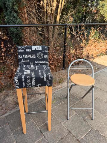 Barkruk in goede staat. De zitting heeft een zwart-witte print met tekst. De poten zijn van hout en er is een metalen voetsteun aanwezig. De kruk is stevig en stabiel.