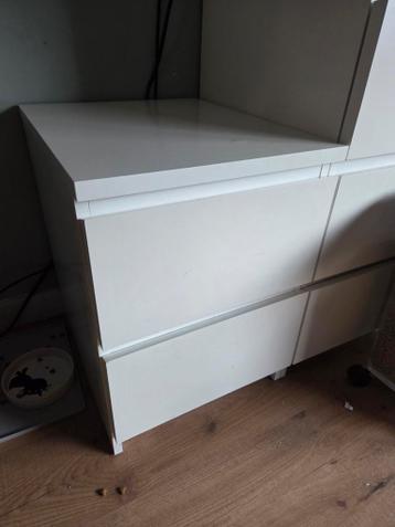 Een wit nachtkastje met twee lades. Er zijn wat gebruikssporen zichtbaar op de bovenkant, zoals te zien op de foto's. Het kastje is 55 cm breed.