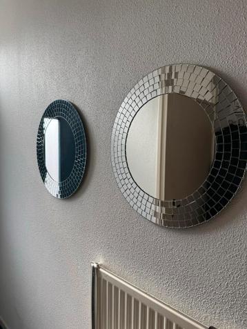 Twee ronde spiegels met een mozaïekrand. De rand bestaat uit kleine vierkante spiegelstukjes. De spiegels zijn 5 euro per stuk.