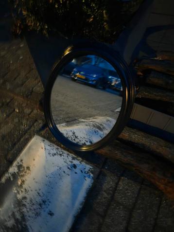 Een ronde spiegel met een zwarte rand. De spiegel is geschikt voor aan de muur. De spiegel staat voor de oprit.. Mag gratis mee