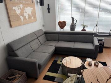 Grijze hoekbank 250cm x 230 cm. Hoofdsteunen omhoog geklapt worden. Hoekzitting stof is wel bijna versleten andere zittingen zijn nog netjes.