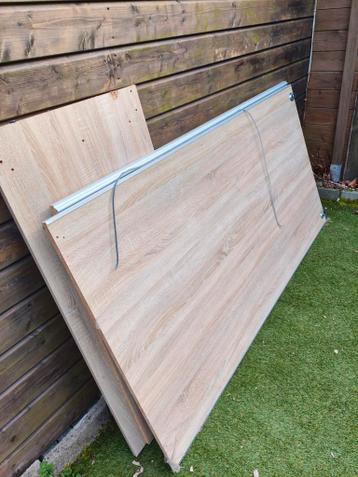 Kastplanken en deuren van een kledingkast. De planken zijn 202 cm hoog, 100 cm breed en 1,5 cm diep. De deuren zijn wit en hebben een beschadiging aan de onderkant, zoals te zien is op de foto's.