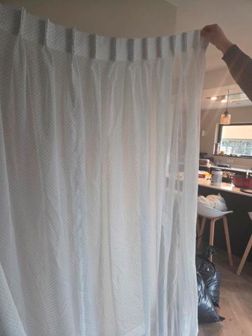 Set van twee inbetween gordijnen, wit met charmante blauwe stipjes. Elk deel is ongeveer 1,28 meter breed en 2,59 meter hoog. De gordijnen zijn voorzien van haakjes, klaar om aan een gordijnrails te h