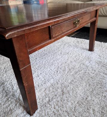 Deze eiken salontafel is 1 meter bij 1 meter. Er zitten twee lades in de tafel. De tafel is gebruikt en heeft wat sporen van gebruik, zoals te zien op de foto's.