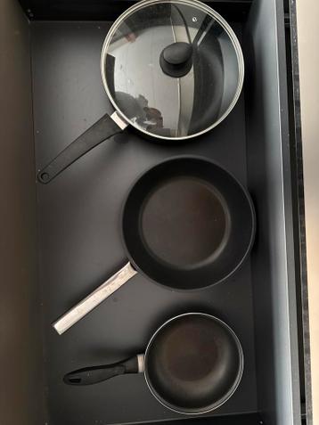 Een set van drie pannen. Drie koekenpannen waarvan één met glazen deksel.