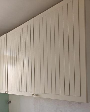 Dubbele bovenkast met een breedte van 120 cm en een hoogte van 92 cm. De kast heeft een lichte kleur en verticale groeven in de deuren.