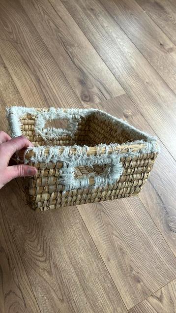 Fairtrade mand van de hema witte materiaal laat wat los riet zit nog prima in elkaar misschien leuk om zelf en andere rand op te maken? Op te halen in steenwijksmoer