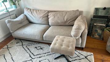 Uiterlijk woensdag ophalen. Ivm een nieuwe bank bieden wij aan: een stoffen bank in lichte kleur met een bijpassende voetensteun. De bank heeft twee zitkussens en losse rugkussens. De voetensteun is g