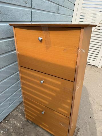 Een ladekast met drie lades. De kast is lichtbruin van kleur en heeft zilverkleurige knoppen.