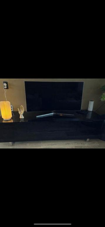 Gratis ophalen!!! Strak en modern tv meubel met een zwarte, glanzende afwerking. 2 Laden en 2 deurtjes. Zilveren poten. Moeilijk om op te foto te krijgen maar de kast heeft wat gebruik sporen. Wat ple