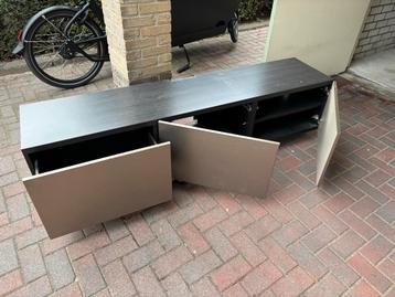 Ikea bestå tv-meubel zwart. Het meubel heeft twee deuren en één lade (links) de afmetingen zijn 180x42x38 cm. Kastdeurtjes zijn te stellen.