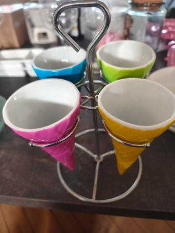 Deze set bestaat uit vier kleurrijke ijshorentjes in een standaard. Ze zijn nooit gebruikt en zien er nog goed uit.