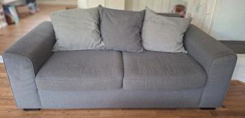 Grijze stoffen bank. De bank is 182 cm breed en 90 cm diep. Inclusief kussens. Gratis af te halen tussen 30 maart en 1 april.