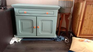 Deze vintage kast heeft wat verfkrassen. De achterkant is deels open, dit was handig voor kabels van een dvd-speler en spelcomputer. De afmetingen zijn breedte 80 cm, diepte 40 cm en lengte 66 cm.