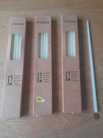 Set van 36 dunne kaarsen in een mooie crèmekleur, verdeeld over 3 verpakkingen van elk 12 stuks. Ideaal voor sfeervolle avonden of als decoratie. De kaarsen zijn nieuw en ongebruikt. De lengte van de