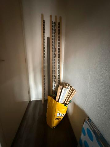 Lattenbodem van 140 cm breed. De lattenbodem is gedemonteerd en de latten zitten in een gele tas. De zijbalken staan tegen de muur.