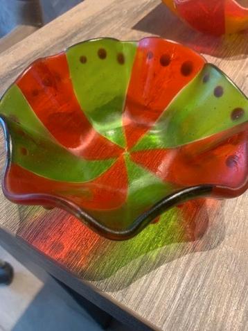 Dit handgemaakte glazen schaaltje is in een perfecte staat. Vertoont geen beschadigingen. De diameter is 14cm.