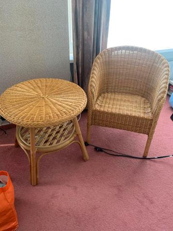 Een rotan stoeltje en een bijpassend tafeltje. Beide items zijn in goede staat. Het tafeltje is rond en heeft een extra plankje onder het blad. Het stoeltje heeft een ronde rugleuning en armleuningen.