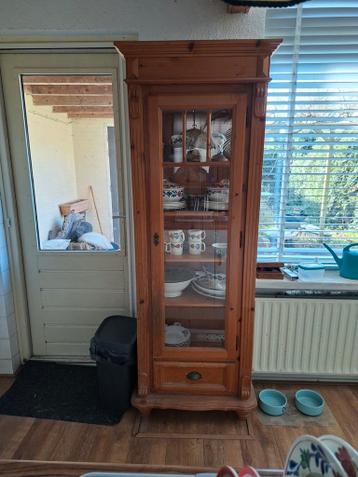 Grenen buffetkast met een glazen deur en een lade. De onderste lade gaat helaas niet open. De kast heeft meerdere planken voor spullen. Afmetingen: breedte 62 cm, diepte 36 cm, hoogte 190 cm. Ophalen