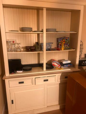 Gratis! Een crèmekleurige servieskast met een bovenkant met open planken en een onderkant met lades en deuren. De kast heeft een landelijke uitstraling en biedt veel opbergruimte. De achterwand van de