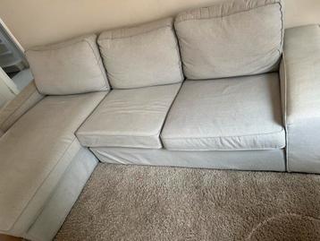 Deze lichtgrijze hoekbank heeft een chaise longue aan de linkerkant. De bank heeft drie zitkussens en drie rugkussens. De stof is licht van kleur en heeft een subtiele textuur. De hoekbank heeft uitwa