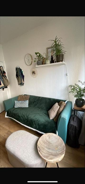 Een groene bank met een strak design. De bank is erg comfortabel en stevig. De versleten stof kan worden bedekt met een kleedje (niet bijgeleverd) of worden vervangen. Ophalen het liefste zaterdag a.s