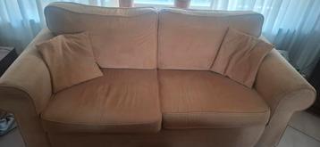 Dit is een bankstel met twee losse fauteuils. De bank en de fauteuils zijn beige van kleur en hebben stoffen bekleding. De set is gebruikt.