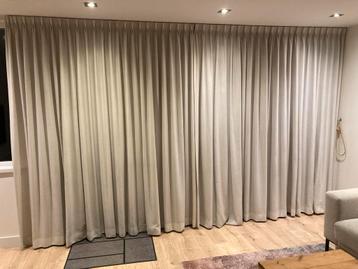 Deze gordijnen zijn gebroken wit van kleur en lijken van een stevige stof gemaakt te zijn. Ze hangen tot op de vloer en zijn geplooid. De gordijnen bedekken een brede muur. De hoogte van het plafond i