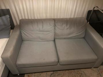 Deze tweezitsbank is licht grijsblauw van kleur. Er zitten wat vlekken op, maar de hoezen van de kussens kunnen eraf en zijn wasbaar. De bank is gebruikt. Gratis op te halen tot 1 april.